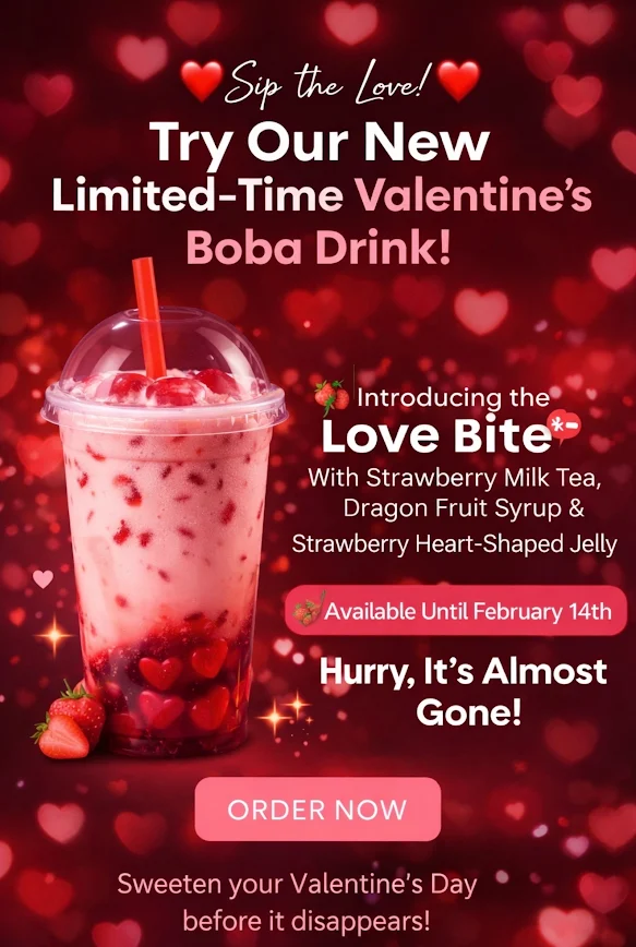 Introducing the Love Bite With Strawberry Milk Tea, Dragon Fruit Syrup & Strawberry Heart-Shaped Jelly